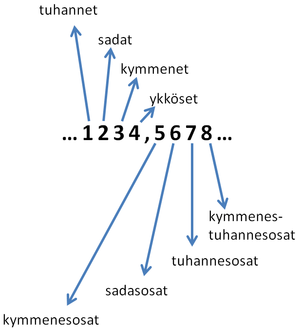 Tavallisessa eli kymmenjärjestelmässä luvussa 123 numero 1 ilmoittaa satojen, 2 kymmenien ja 3 ykkösten lukumäärän.