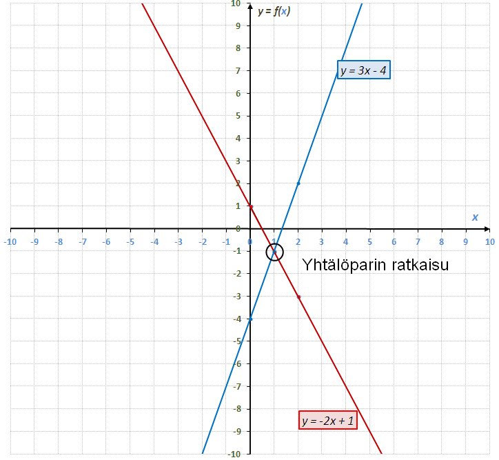 Kuvassa 1 on kahden yhtälön kuvaajat, jotka risteävät pisteessä (1, − 1), jossa x = 1 ja y = − 1. Kyseinen piste on ratkaisu yhtälöparille