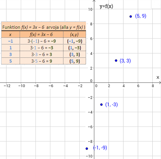 Kuvassa 1 on ensin taulukon avulla laskettu funktion \(f(x)=3x−6\) arvot neljällä muuttujan \(x\) arvolla. Saadut pisteparit \((x,y)\) on merkitty koordinaatistoon (siniset pallukat).