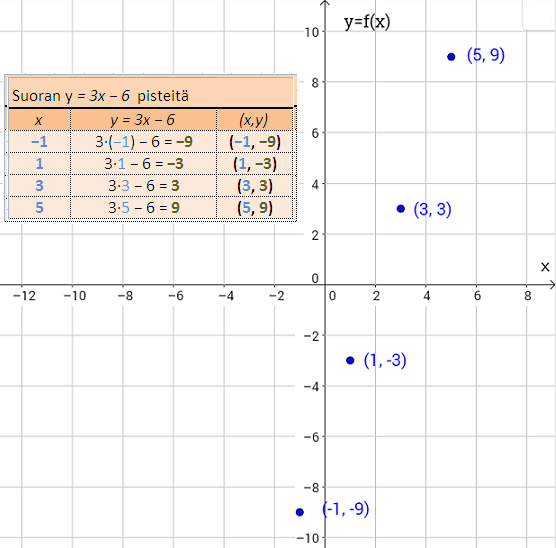 Kuvassa 1 on esitetty suoran piirtämisen vaiheet. Taulukon avulla lasketaan neljä (x,y)-lukuparia, jotka merkitään koordinaatistoon. Lopuksi piirretään suora pisteiden kautta.