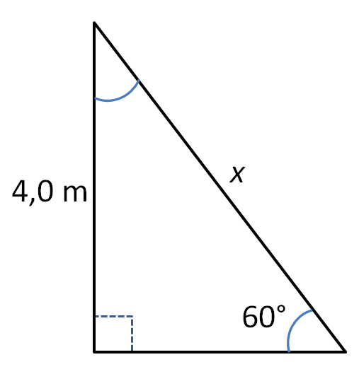 - Muodostetaan yhtälö ja ratkaistaan se. Yksikkö on koko ajan metri, joten voidaan jättää se pois yhtälöstä: \begin{align*} \sin60° &= \frac{4,0 }{x} \quad \Vert \cdot x \\ x \cdot \sin60° &= 4,0 \quad \Vert :\sin60° \\ x &= \frac{4,0}{\sin60°} ≈4,62 \quad \ \\ \end{align*}