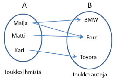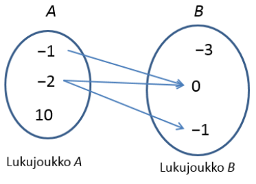 Kuvassa 2 on joukot \(A\) ja \(B\) ja nuolilla merkitty kaikki mahdolliset relaatiot \(a < b\), kun \(a\in A\) ja \(b \in B\). Mahdolliset relaatiot voidaan merkitä näin: \(-1 < 0\), \(-2 < 0\) ja \(-2 < -1\).