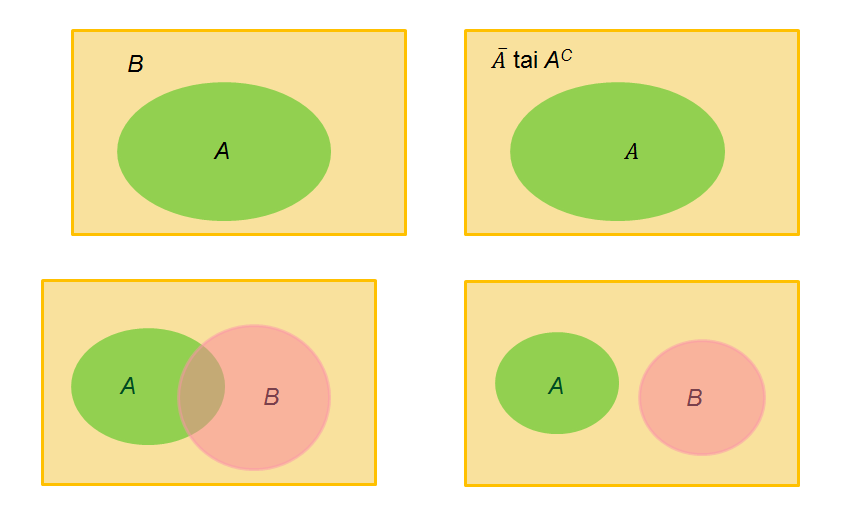 Kuvassa 1 on tyypillisiä joukkomerkintöjä. Suorakulmio viittaa perusjoukkoon, joka on eräänlainen "kaikkien joukkojen joukko". Jos esimerkiksi soikioilla merkityt joukot ovat maita, voisi perusjoukko olla koko maapallo.