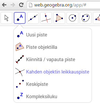 Vihje: kahden kuvion leikkauspiste kannattaa aina hakea Geogebran valmiin toiminnon avulla (Kuva 2). Tällöin menee piste varmasti oikeaan paikkaan.