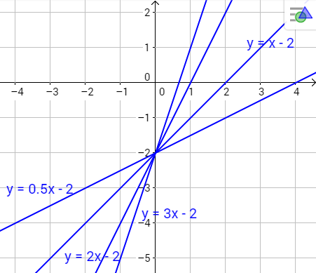 Kuvassa 2 puolestaan suorien kulmakerroin vaihtelee, mutta vakiotermi \(b\) pysyy samana.