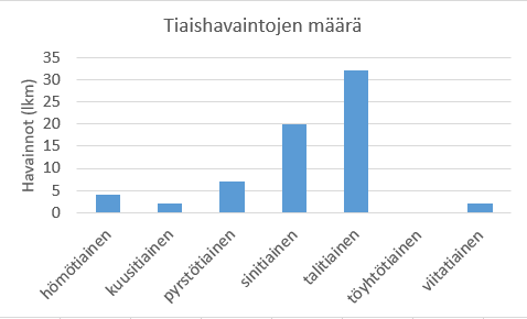 Kuvassa 1 on pylväskaavio lintuhavainnoista. Tässä mahdollisia erilaisia havaintoja on vain seitsemän, joten pylväät piirretään erilleen.